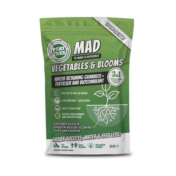 MAD Vegetables & Blooms combines an organic water-retaining granule with a peat-free fertiliser (N-P-K 10-5-0) and a powerful seaweed bio-stimulant.